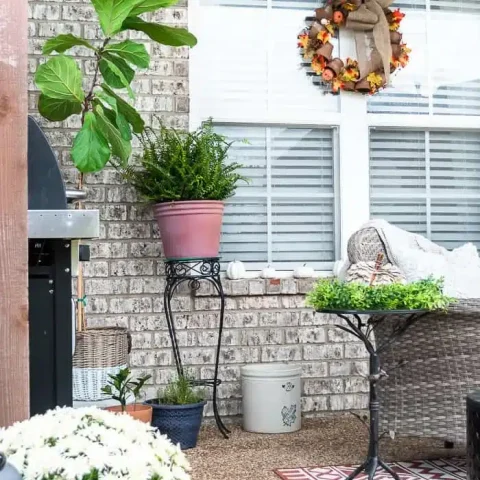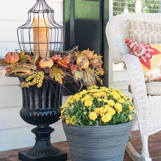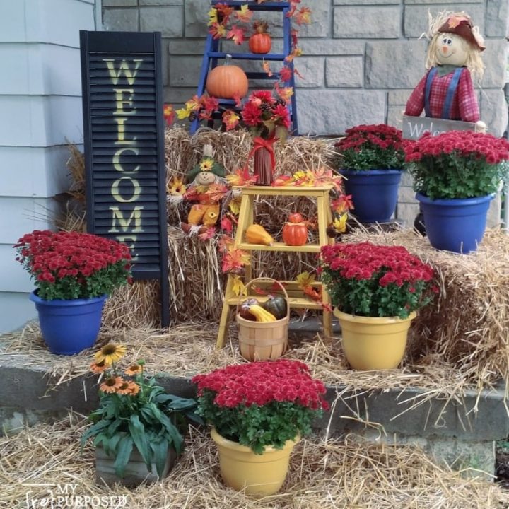 With a few things on hand, some paint, and a touch of creativity, Gail from My Repurposed Home styled an inviting fall porch. Repurposed flowerpots and a ladder-turned-plant-stand show that seasonal charm doesn’t require a big budget.