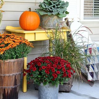 Embrace the season with buckets of blooming mums and plenty of pumpkins to make your porch warm and inviting.