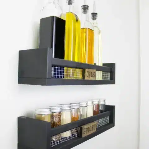 Use affordable hardware cloth and IKEA Bekvan shelves to create industrial modern kitchen shelves. Check out the awesome wood burned labels that really take this project to the next level.
