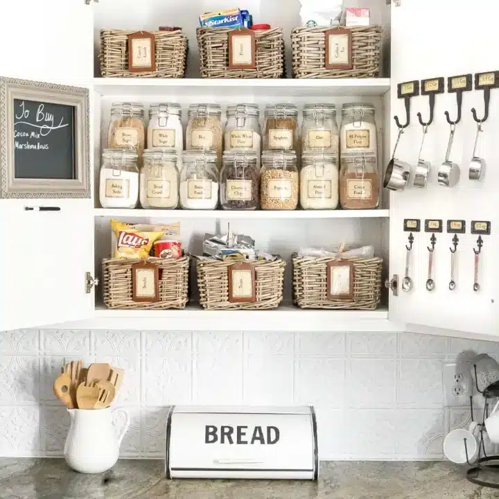 Lauren from Bless'er House used IKEA Korken jars for keeping dry goods fresh and Byholma baskets to store snacks. The baskets have a gorgeous gray wash on them.