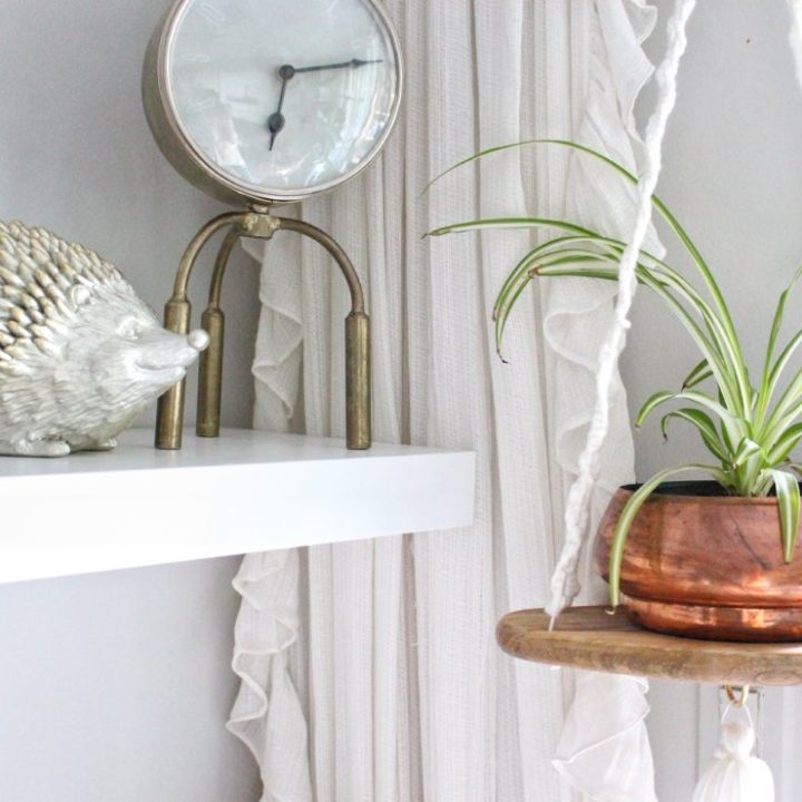 An IKEA Fascinera cutting board and yarn are used to make a beautiful hanging plant shelf. This is such a clever idea!