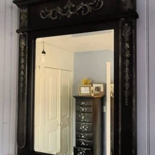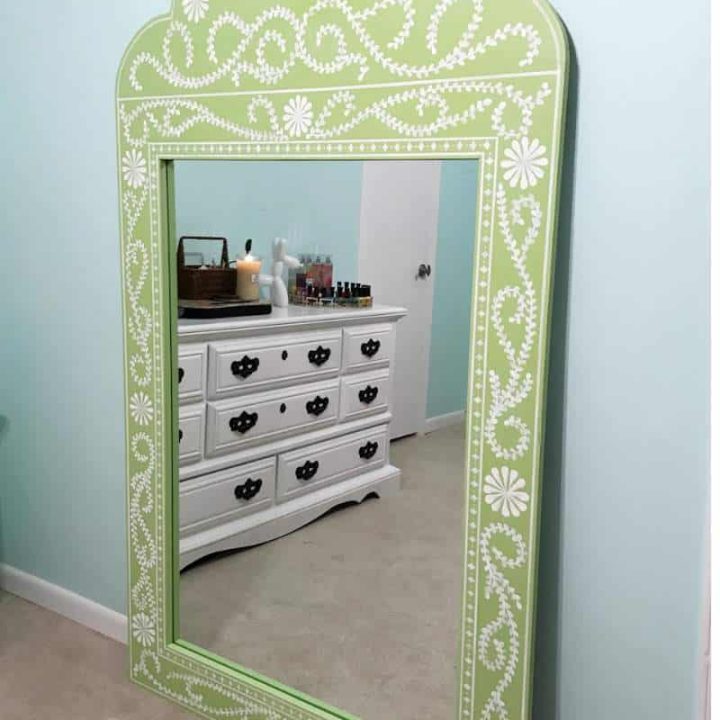 We've all seen, or maybe even own, one of those thick plate glass mirrors that are often used in older bathrooms unframed. Think outside the box to turn it into an original framed full-length mirror. The design is modeled after a floral bone inlay style.