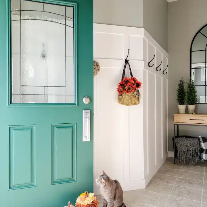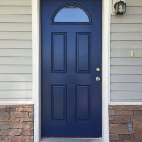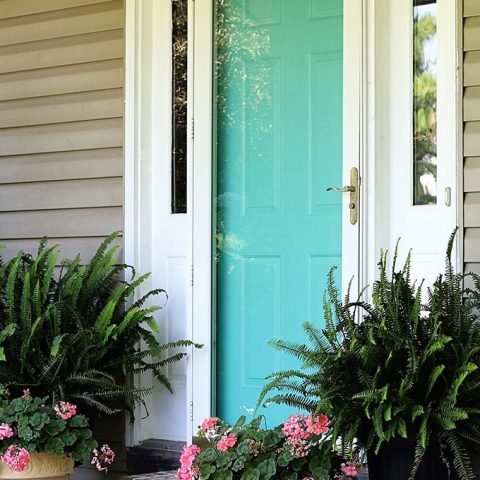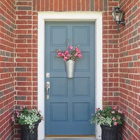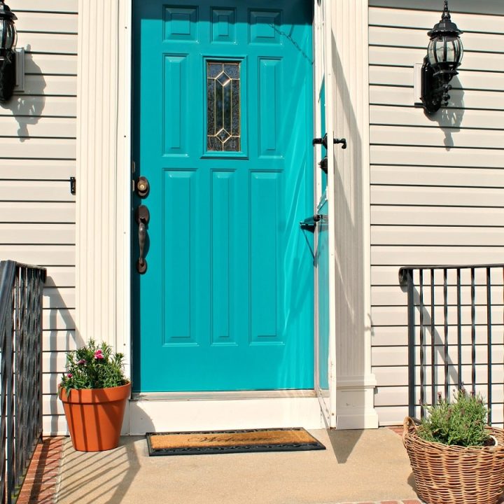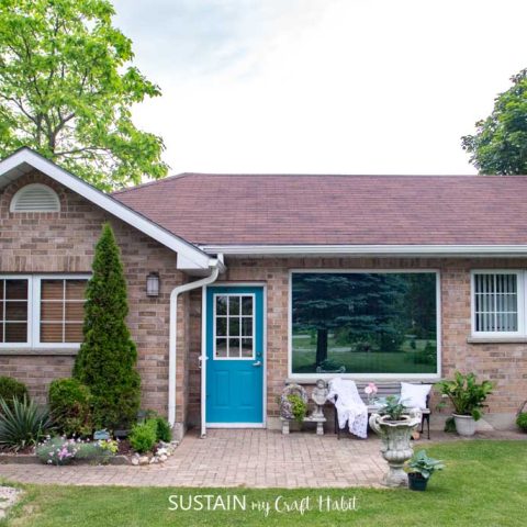 Jane from Sustain My Craft Habit picked out a bright and cheery Harbor Blue paint color for her front door and it looks just lovely! It adds a wonderful pop of color to the brick house.