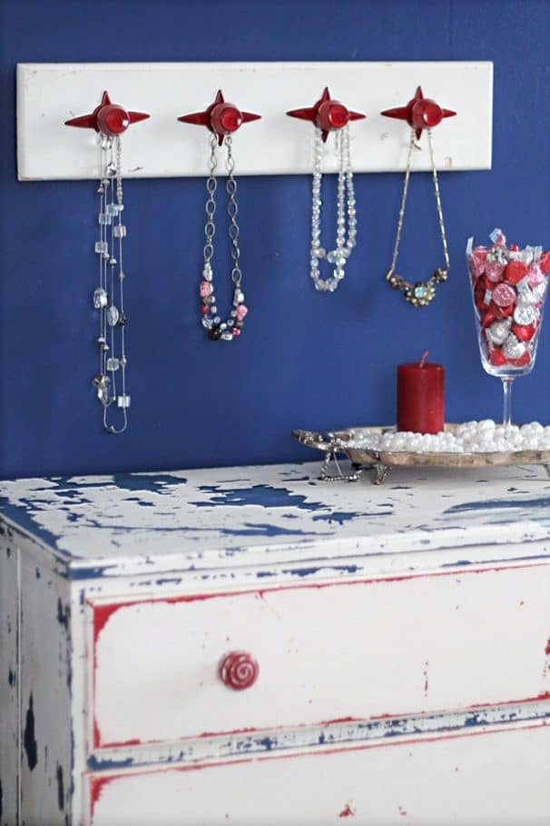 The red white and blue chest of drawers is a Nashville Flea Market find and I had to do a lot of work on it. You can see the project here….Flipping Furniture: Red White and Blue Painted Furniture