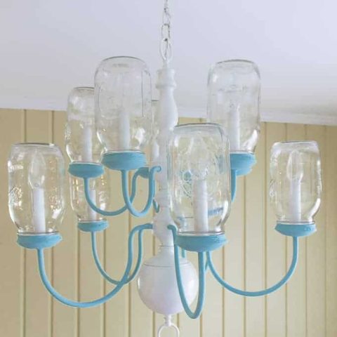 Follow the step-by-step tutorial to turn an old chandelier into a farmhouse style ceiling light with mason jars. The aqua blue is such a stunning color!