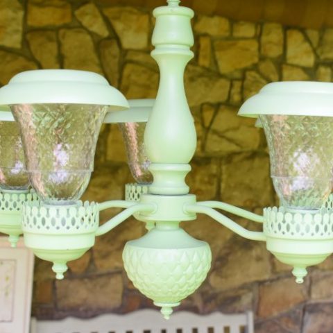 Here is a budget-friendly chandelier makeover that can be used indoors or out. Look at how gorgeous the soft green paint color is!