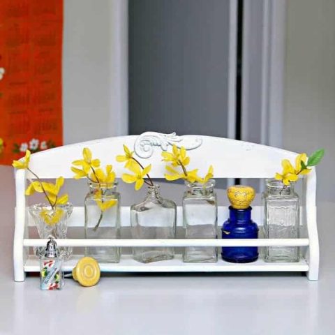 Transform a repurposed spice rack into a stylish organizer by adding furniture knob tops for a unique and functional touch.