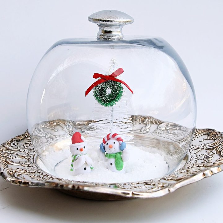 I enjoy creating miniature snow scene displays during the Christmas holidays. One of the best parts is how easy they are to switch up each year. This glass display with a repurposed furniture knob is the perfect example!