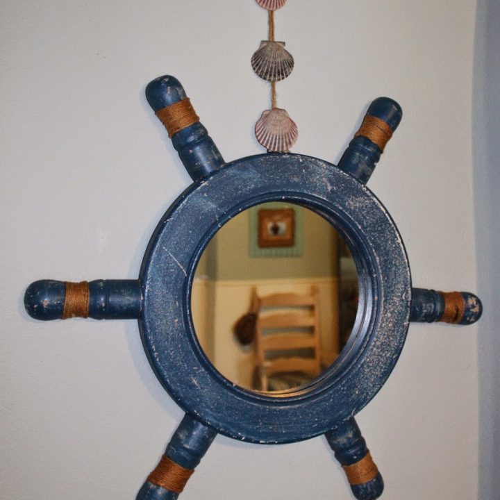 The knob came from an old entertainment center I repurposed, and I scored the ship’s wheel mirror at a yard sale.
