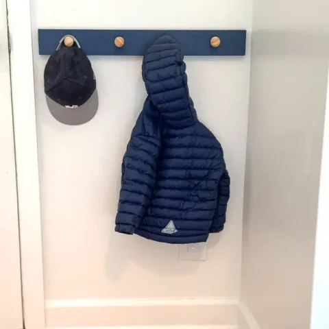 IKEA RAST knobs were repurposed in this boy's bedroom to create a fun and functional DIY coat rack. It’s an easy project that adds personality and organization to the space.
