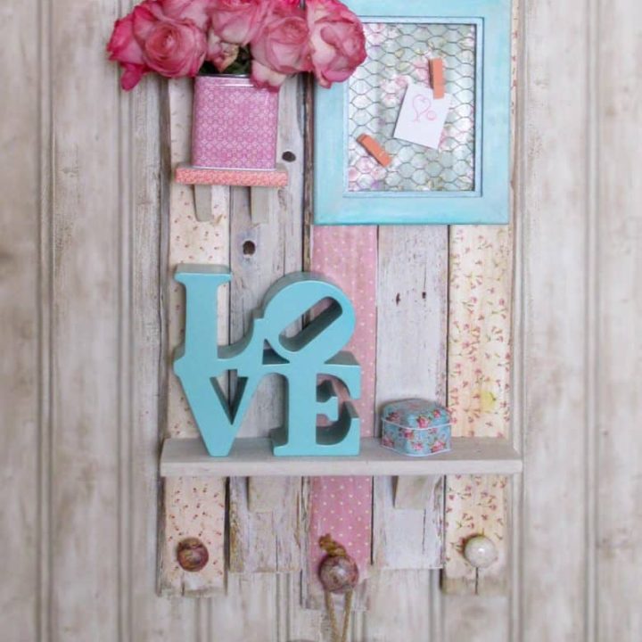 This scrapbook shelf was made using pallet wood and old wooden door knobs, giving it a perfect blend of rustic charm and functionality.