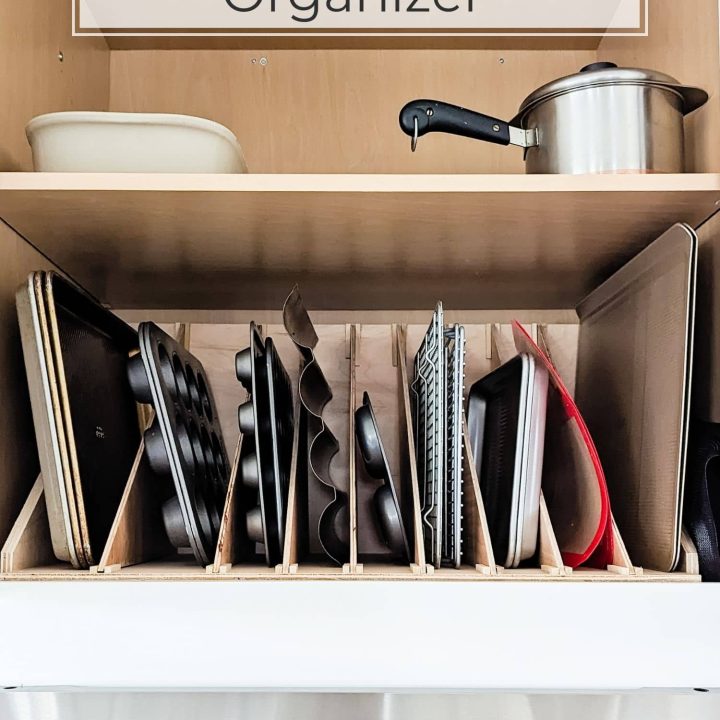 This homemade cookie sheet organizer helps you arrange a variety of items, including baking sheets, bread pans, and muffin tins.