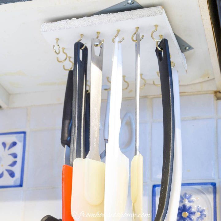 This homemade storage rack designed to hang kitchen utensils fits neatly under your cabinets, allowing for easy access and organization. You can construct it in under an hour and for under $10, making it a space-saving solution.