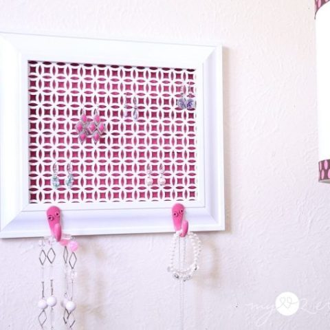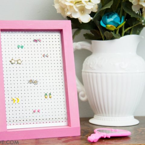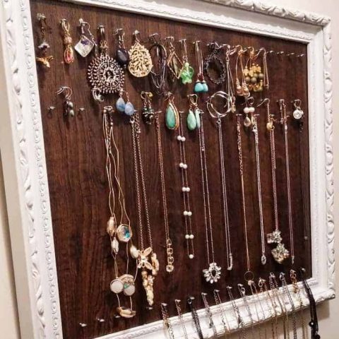An ornate picture frame, a few paint stir sticks, and some hooks make a lovely DIY jewelry organizer. It’s simple, but perfect for displaying necklaces and dangly earrings in a pretty way.