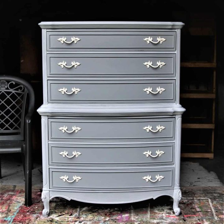 This chest of drawers is a stunning beauty—one of my favorite furniture makeovers. I was able to refresh it with paint and keep the original furniture knobs and French Provincial look.