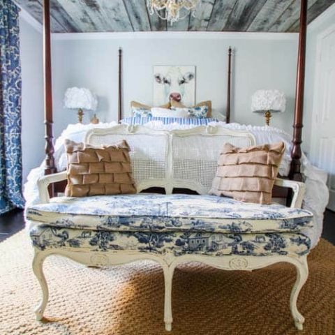 Heather from The Heathered Nest created a stunning Toile bench with tons of detail and texture. It makes quite the statement at the foot of a bed.