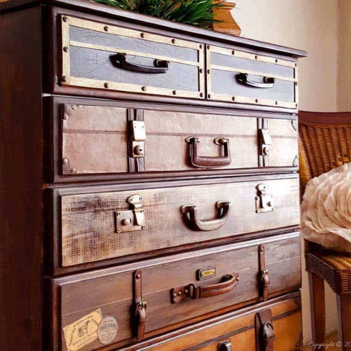 A plain-Jane pine dresser begging for a makeover, and a collection of well-traveled, character-rich vintage suitcases make the perfect pair! This is such a unique piece that can be enjoyed for years.