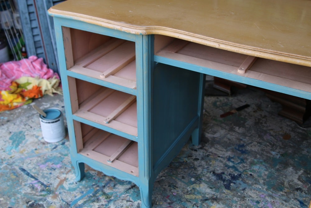 When I flipped the desk upright, I began by painting the kneehole area—but I saved the lip on the middle drawer space until I finished the underneath.