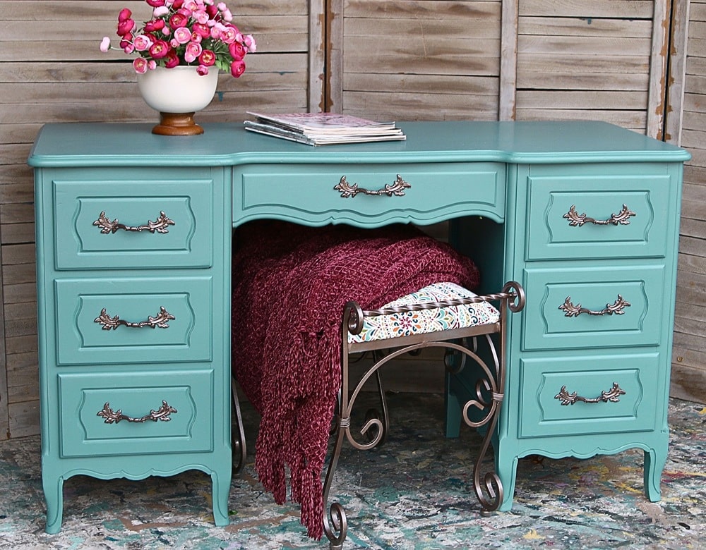 You know how it goes. My daughter’s bedroom was wall-to-wall French Provincial with a desk and hutch, nightstands, a headboard, and a tall chest of drawers.