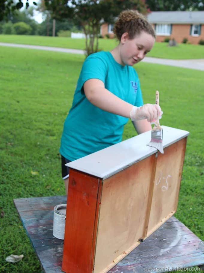 We applied the primer one day, and the latex paint the next day. She selected a soft gray paint color and a little lighter than the primer. One coat of paint was all that was needed. By the time the project was finished, Tenley was almost a pro.
