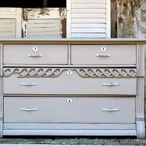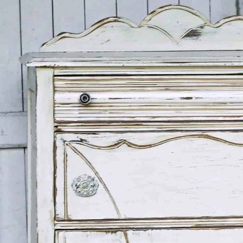 The vintage dresser was already painted when I found it at my favorite junk shopWhen I found the vintage dresser at my favorite junk shop, it was already painted. I brought it home, distressed the paint heavily, and then waxed it with dark wax.
