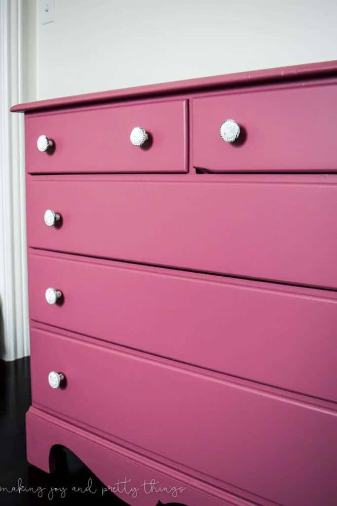 Learn how to turn a simple old dresser into a bright, colorful farmhouse nursery piece. This beautiful DIY pink dresser project is both fun and charming!