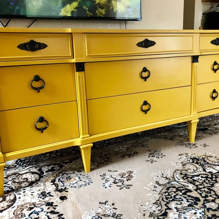 Mustard yellow is a bold and beautiful choice for a thrifted dresser.