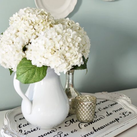 Turn a simple thrift store tray into a charming piece of home décor with just a fresh coat of white paint and a beautiful French love letter stencil! This easy makeover adds vintage elegance and a touch of romance,