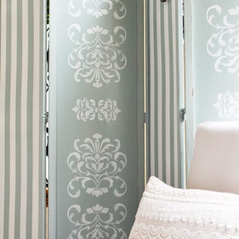 A thrift store folding screen makes the perfect blank canvas for creative stencil designs in a beautiful blue hue. This screen adds a touch of luxury to the bedroom decor and is surprisingly simple to DIY.